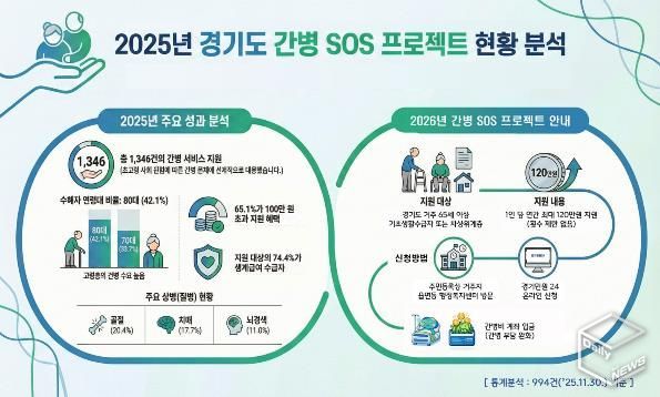초고령사회 진입에 따른 간병 부담 문제에 선제적으로 대응하기 위해 시행되고 있는 간병 SOS 프로젝트는 65세 이상 저소득층 노인을 대상으로 연간 최대 120만 원의 간병비를 지원한다. 지급 횟수나 회당 지급 금액은 제한이 없다. 지원 대상은 경기도 내 기초생활수급자(생계·의료·주거) 또는 차상위계층 중 상해나 질병으로 병원급 의료기관 이상에 입원해 간병서비스를 이용한 경우다.
