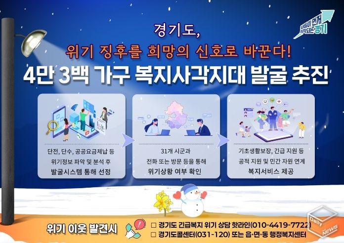 한경수 경기도 복지사업과장은 “겨울철은 저소득층의 난방비 부담 증가로 취약계층의 어려움이 늘어나는 시기인 점을 고려해 에너지취약계층을 포함한 복지사각지대를 선제적으로 찾아서 지원하고자 노력하고 있다”면서 “위기 이웃을 발견하면 경기도 긴급복지 위기상담 핫라인, 경기도콜센터 또는 읍·면·동 행정복지센터로 연락해 주시기를 부탁드린다”라고 말했다.