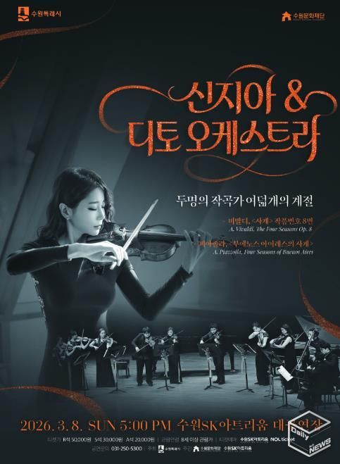 수원문화재단은 비발디와 피아졸라의 명작 ‘사계’를 한 무대에서 만나는 '신지아&디토오케스트라'를 오는 3월 8일 일요일 오후 5시 수원SK아트리움에서 개최한다.