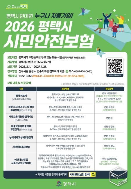 e데일리뉴스 | 평택시는 일상생활에서 예기치 못한 재난·사고 피해를 지원하기 위한 '2026년 평택시 시민안전보험'을 갱신하고, 시민 누구나 혜택을 받을 수 있도록 홍보에 나섰다고 밝혔다.