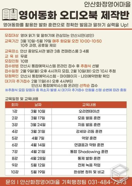 e데일리뉴스 | 안산시가 설립하고 안산대학교가 운영하는 안산화정영어마을이 성인 영어 학습자를 위한 ‘영어동화 오디오북 제작반’을 3월부터 5월까지 10주 과정으로 안산시 중앙도서관에서 운영한다고 4일 밝혔다.