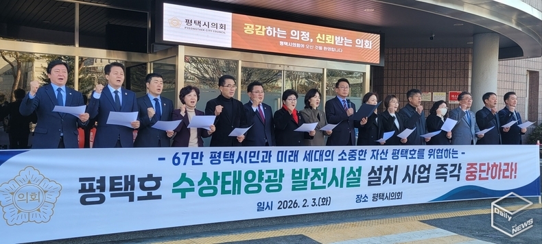 e데일리뉴스 | [평택=강경숙 기자] 평택시의회(의장 강정구)는 3일, 시의회 본관 앞에서 ‘평택호 수상태양광 발전시설 설치 중단 촉구 성명서’를 발표했다.