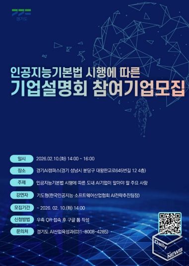 e데일리뉴스 | 경기도가 지난 1월 22일 시행된 ‘인공지능 기본법’에 대한 도내 기업들의 이해를 돕기 위해 10일 오후 2시 판교 경기AI캠퍼스에서 AI 기업 대상 설명회를 개최한다.