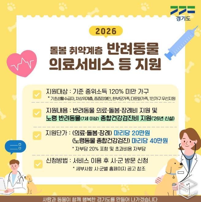 변희정 경기도 반려동물과장은 “취약계층의 외로움을 덜어줄 수 있는 반려동물이 더 오래 건강하게 곁을 지킬 수 있도록 지원 규모도 확대하고 노령 동물 종합건강검진 지원도 신설했다”며 “경기도는 사람과 동물이 서로의 온기를 나누며 끝까지 함께 걸어갈 수 있는 따뜻한 반려 문화를 만들어 가겠다”고 말했다.