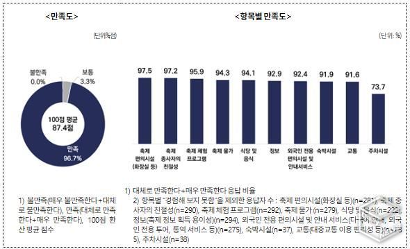 실제 외국인 축제 만족도는 평균 87.4점으로 나타났으며, 응답자의 98%는 ‘타인에게 추천할 의향이 있다’고 답했다. 2026년 재방문 의향 역시 80.7%로 조사돼, 일회성 방문이 아닌 반복 방문 가능성도 확인됐다.