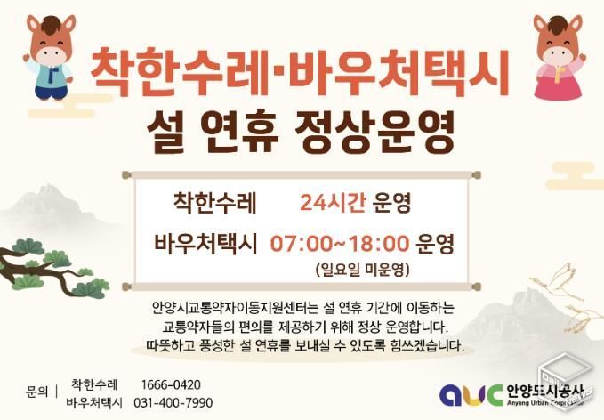 e데일리뉴스 | 안양시는 2월 14일부터 18일까지 설 명절 연휴 기간에도 ‘착한수레’와 ‘바우처택시’를 정상 운영한다고 11일 밝혔다. 두 교통수단은 대중교통 이용이 어려운 장애인·임산부·영유아 등 교통약자의 병원 진료, 등·하교, 출·퇴근 등 일상 이동을 지원한다.