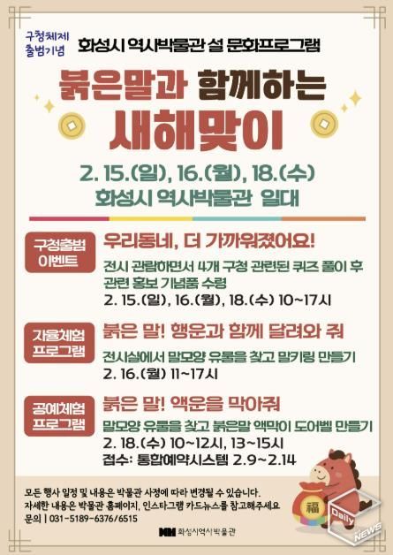 e데일리뉴스 | 화성특례시는 설 연휴 기간인 오는 2월 15일부터 18일까지 화성시 역사박물관에서 ‘붉은 말과 함께하는 새해맞이’ 설날 문화프로그램을 운영한다.