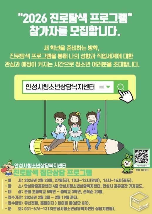e데일리뉴스 | 안성시청소년상담복지센터는 오는 2월 20일과 27일, 2일간 청소년을 대상으로 ‘겨울방학 프로그램 – 진로탐색’을 운영한다고 밝혔다.