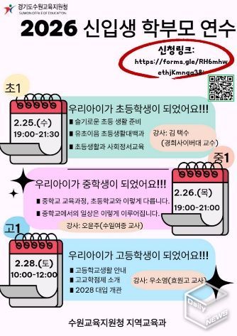 e데일리뉴스 | 경기도수원교육지원청은 오는 2월 25일부터 28일까지 사흘간 관내 초‧중‧고등학교 입학을 앞둔 예비 신입생 학부모를 대상으로'2026년 신입생 학부모 연수'를 운영한다.