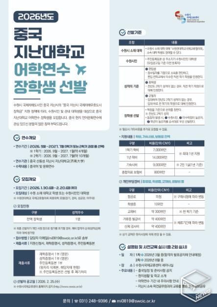 e데일리뉴스 | 수원특례시는 2월 20일까지 ‘2026년도 지난대학교 어학연수 장학생 프로그램’ 참가자 1명을 모집한다.