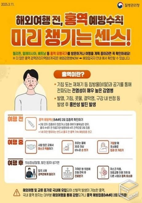 우리나라처럼 평소 홍역 발생이 거의 없는 국가에서도 해외 유입 사례로 인해 지역사회 전파 위험이 커지고 있어 여행 전 예방접종의 중요성이 더욱 강조되고 있다.