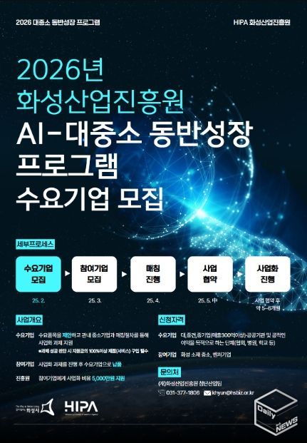 e데일리뉴스 | 화성산업진흥원은 AI 기술 사업화 협력을 통해 산업 전반의 경쟁력을 높이기 위해 오는 2월 25일까지 ‘2026년 AI-대중소 동반성장 프로그램’ 수요기업을 모집한다고 밝혔다.