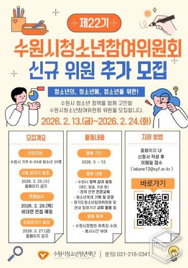 e데일리뉴스 | 수원시청소년청년재단(이사장 최종진)은 수원시 청소년의 정책 참여 확대와 권익 증진을 위해 '제22기 수원시청소년참여위원회' 위원을 추가 모집한다고 밝혔다.