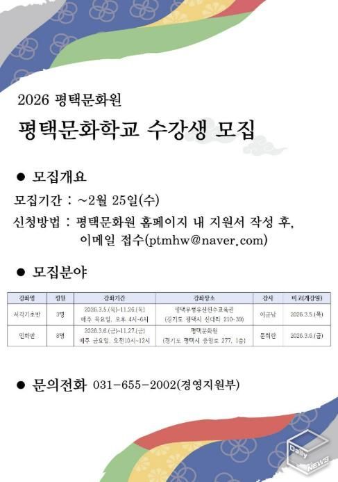e데일리뉴스 | 평택문화원은 지역 전통문화의 계승과 시민 문화향유 기회 확대를 위해 '2026 평택문화학교'를 운영하고, 총 3개 강좌 가운데 민화반과 경기도무형유산 서각장 이규남의 서각기초반 2개 강좌의 수강생을 모집한다. 모집 대상은 평택시민 누구나 가능하며, 접수는 2026년 2월 25일 오후 6시까지 선착순으로 진행된다.