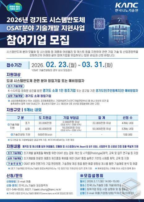 e데일리뉴스 | 경기도가 시스템반도체 산업 생태계 강화를 위해 ‘2026년도 경기도 시스템반도체 후공정(OSAT) 분야 기술개발 지원사업’에 참여할 도내 예비창업자 및 창업기업을 3월 31일까지 모집한다.