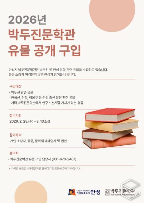 유물 구입 서류 접수 기간은 2월 25일부터 3월 13일까지다. 매도를 희망하는 개인이나 법인은 안성시청 홈페이지에서 서식을 내려받아 작성한 뒤, 등기우편 또는 전자우편으로 제출하면 된다.