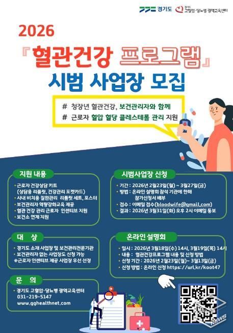 혈관건강 프로그램 시범운영 사업장 모집은 2월 23일부터 3월 27일까지 진행된다. 온라인 설명회는 3월 18~19일 이틀간 개최하며, 최종 선정된 사업장은 3월 31일 발표한다. 구체적인 프로그램 내용 및 신청방법은 온라인 설명회에서 재차 안내할 예정이다.