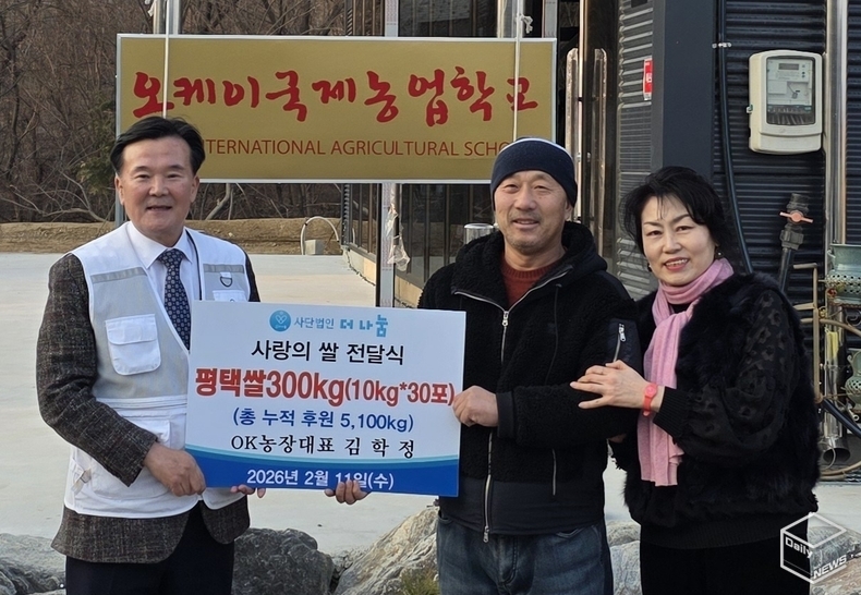 e데일리뉴스 | [평택=강경숙 기자] 농부의 손끝에서 시작된 한 톨의 쌀이 6년의 시간을 거쳐 5톤의 사랑으로 쌓였다. 밥 한끼에 담긴 온기가 평택의 곳곳에서 조용히 번지고 있다. 평택 지역사회에 훈훈한 나눔 소식을 꾸준히 전하는 이는 팽성읍 소재 OK농장 김학정 대표로 올해도 어김없이 설을 맞아 햅쌀 300kg을 ‘더나눔’에 전달한 것이다.