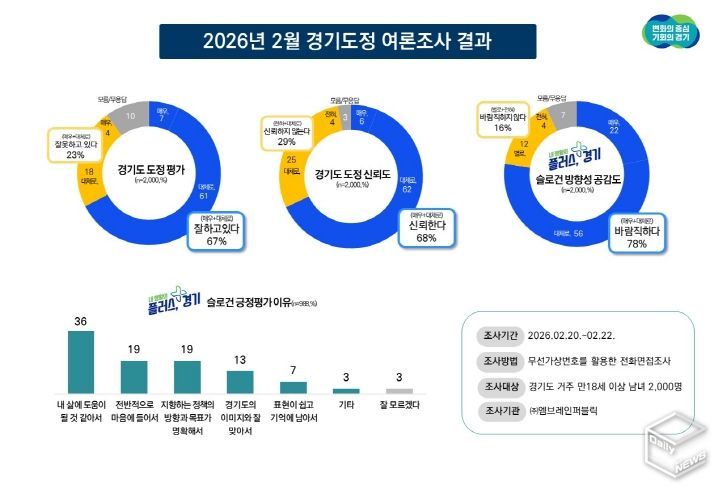 경기도가 ㈜엠브레인퍼블릭에 의뢰해 2월 20일부터 22일까지 실시한 정기 여론조사 결과, 경기도정에 대해 “잘하고 있다”는 응답은 67%, “잘못하고 있다”는 23%, “모름·무응답”은 10%였다.