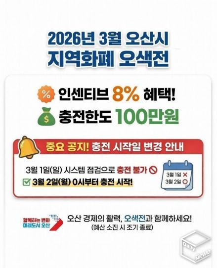 e데일리뉴스 | 오산시는 3월 지역화폐 ‘오색전’ 인센티브를 충전 금액의 8%로 운영한다고 밝혔다. 시민 1인당 충전 한도는 100만 원으로, 최대 8만 원까지 인센티브 혜택을 받을 수 있다.