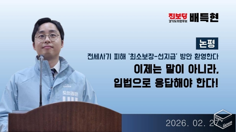 e데일리뉴스 | 2월 26일 발표된 전세사기특별법 개정 방향은 답보 상태에 놓여 있던 피해 구제 논의에 중요한 물꼬를 튼 조치입니다. ‘최소보장제’와 ‘선지급-후정산’ 방안은 그동안 피해자대책위와 시민사회가 일관되게 요구해 온 내용으로, 정부·여당이 전세사기를 사회적 재난으로 인식하고 국가 책임을 명확히 했다는 점에서 의미가 큽니다. 경기도의원 후보로서 이번 발표를 환영합니다.