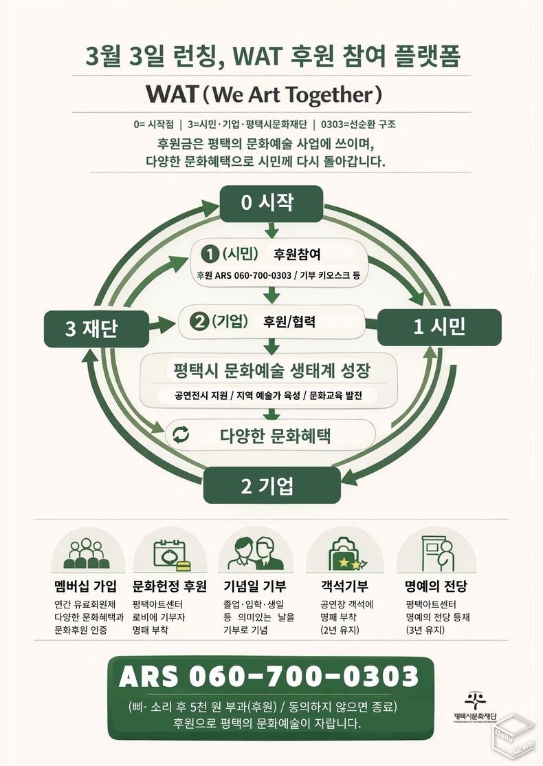 재단 관계자는 “WAT는 시민의 자발적 참여를 가장 우선으로 설계한 문화예술 후원 플랫폼”이라며 “시민 참여를 바탕으로 기업 협력까지 단계적으로 확장해 평택의 문화예술이 유기적으로 연계되는 기반을 마련하겠다”고 밝혔다.