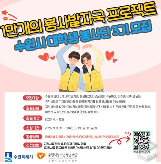 e데일리뉴스 | 수원시청소년청년재단 수원시청년지원센터는 3월 3일부터 3월 13일까지 지역사회 봉사 문화를 확산하고 대학생들의 사회공헌 활동을 지원하기 위한 '1만 개의 봉사발자국' 참여 동아리를 모집한다.