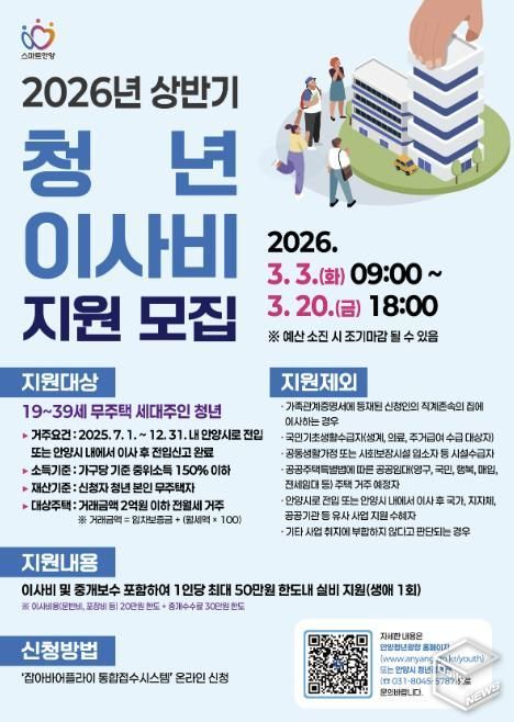 시는 2025년 7월 1일부터 12월 31일 내 안양시로 전입하거나 안양시 내에서 이사한 후 전입신고를 완료한 19세 이상 39세 이하의 청년 가구에게 1인당 최대 50만원 한도 내에서 이사비 및 중개보수비를 지원한다.