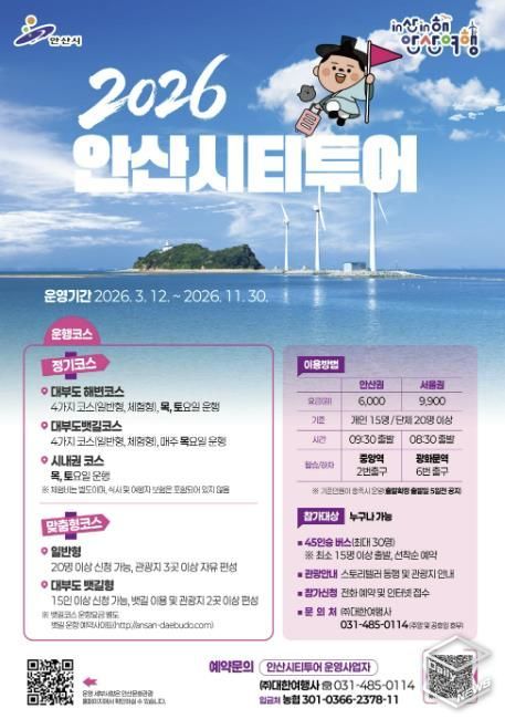 이민근 안산시장은 “2026 안산시티투어는 시화호 뱃길 개통과 함께 안산의 다양한 관광 자원을 연결하는 핵심 관광 콘텐츠가 될 것”이라며 “시민과 관광객 모두가 안산의 매력을 편안하게 즐길 수 있도록 관광 활성화에 힘쓰겠다”고 말했다.