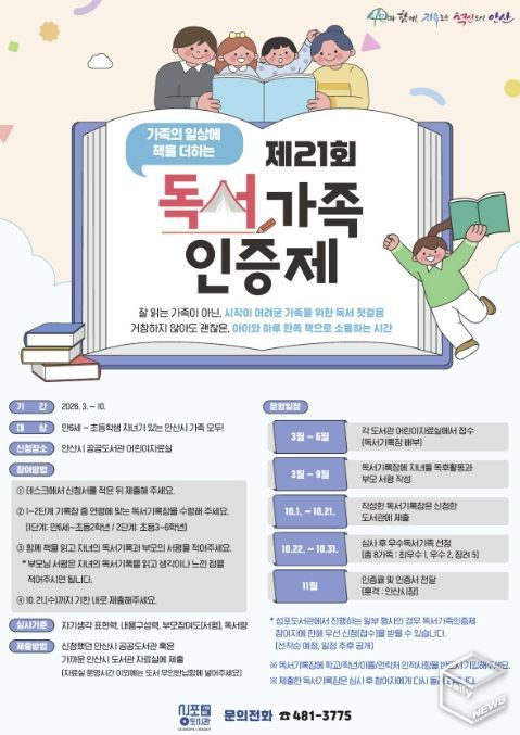 참여 대상은 만 6세부터 초등학생 자녀를 둔 안산시 가족이며, 오는 6월까지 관내 공공도서관 어린이자료실에서 신청할 수 있다. 신청서를 작성한 뒤 연령에 맞는 기록장을 수령하고, 가족이 함께 책을 읽은 후 생각이나 느낀 점을 기록하면 된다.
