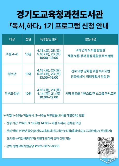 e데일리뉴스 | 경기도교육청과천도서관이 지역주민의 독서 역량 강화와 융합적 사고력 함양을 위해 '2026년 독서, 하다’프로그램을 운영한다.