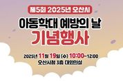 e데일리뉴스 | 오산시는 오는 19일 ‘아동학대예방의 날’과 ‘아동학대예방주간’을 맞아 기념행사 및 온·오프라인 캠페인을 실시한다고 12일 밝혔다. 행사는 19일 오전 10시부터 12시까지 오산시청 대회의실에서 진행되며, ▲1부 아동학대예방의 날 기념식 식전공연, 유공자 표창 시상, 퍼포먼스, ▲2부 부모교육 특별강연으로 구성된다. 특별강연은 리플러스 인간연구소 박재연 소장이 ‘부모를 위한 건강한 대화방법’을 주제로 진행한다. 매년 11월 19일은 아동학대 예방과 방지에 대한 사회적 관심을 높이기 위해 제정된 법정기념일로, 오산시는 매년 기념식과 강연, 캠페인 등을 통해 아동학대 예방의 중요성을 알리는 다양한 활동을 추진해오고 있다. 시는 이달 25일까지 온라인 릴레이 캠페인도 함께 진행한다. 오산시민 누구나 SNS에 아동학대예방 메시지 또는 관련 사진을 업로드해 참여할 수 있다. 또한 11월 24일에는 시청 인근 주요 교차로에서 시민 대상 오프라인 홍보 캠페인을 실시해 아동학대 예방 인식 제고에 나설 예정이다. 박현주 아동복지과장은 “이번 행사가 아동학대 예방의 중요성을 되새기고 아이들에게 더
