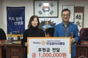 e데일리뉴스 | 안성시동부무한돌봄네트워크팀은 지난 26일 국제로타리 3600지구 안성로타리클럽으로부터 촘촘한 복지 안전망 구축을 위한 후원금 100만 원을 전달받았다. 안성로타리클럽은 매년 지역사회를 위한 봉사와 나눔을 실천하며 지역 발전에 기여해 왔으며, 이번 후원금은 복지 사각지대 발굴과 사례관리 대상자에게 전문적인 복지 서비스를 제공하는 데 사용될 예정이다. 안성로타리클럽 이승재 회장은 “현장에서 발로 뛰며 소외된 이웃을 찾는 안성시동부무한돌봄네트워크팀의 활동에 실질적인 도움이 되길 바란다”며 “앞으로도 지역사회의 다양한 사회공헌 프로젝트를 통해 지역 복지 서비스의 질을 높이는 마중물이 되겠다”고 말했다. 안성시동부무한돌봄네트워크팀 정은주 센터장은 “복지 사업을 더욱 안정적이고 원활하게 추진할 수 있도록 도움을 주신 안성로타리클럽에 깊이 감사드린다”며 “지역 주민에게 필요한 맞춤형 복지 서비스를 제공하는 데 최선을 다하겠다”고 말했다