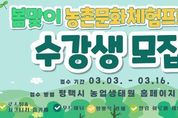 e데일리뉴스 | 평택시는 오는 4월부터 농업기술센터에서 도시민의 정서적 안정과 농촌 문화 가치 확산을 위한 '2026년 봄맞이 농촌문화체험 프로그램’을 운영한다. 이번 프로그램은 자연 재료를 활용해 도시민들이 일상 속 스트레스를 해소하고 농업·농촌을 친숙하게 느낄 수 있도록 기획됐으며, 3일부터 16일까지 교육생을 모집한다. 교육 과정은 실습 중심의 4개 강좌로 구성되어 시민들에게 다채로운 즐거움을 선사할 예정이다. 주요 내용은 △평택 특산물을 활용한 로스팅 및 홈카페 메뉴 만들기 △버려지는 자원을 재활용하는 리사이클링 양말목 공예 △천연 아로마 에센스로 화장품을 직접 만드는 힐링 아로마 클래스 △나무에 온기를 담아내는 현대 우드버닝 등 자연 친화적인 취미 활동으로 꾸며진다. 특히 이번 교육은 어렵게 느껴졌던 ‘탄소중립’이나 ‘지역 상생’이라는 가치를 평택 특산물로 맛있는 메뉴를 만들고 예쁜 소품을 빚어보는 활동에 녹여내, 시민들이 일상에서 즐겁고 친근하게 경험할 수 있도록 구성했다. 평택시 농업기술센터 관계자는 “이번 봄맞이 프로그램이 시민들에게는 배움의 즐거움과 휴식을, 농촌에는 활력을 불어넣