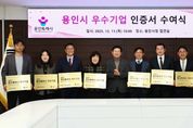 e데일리뉴스 | 용인특례시는 11일 시청 접견실에서 ‘2025년 용인시 우수기업 인증제’ 심의 결과 선정된 ‘올해의 우수기업’ 10개 사에 인증서를 전달했다. 이상일 용인특례시장은 이들 기업 대표와 임직원들을 만나 축하와 격려 인사를 나누고 우수기업 인증서와 현판을 전달했다. 이상일 시장은 “우리 경제가 어려운 가운데서도 기업 활동을 잘 해주셔서 우수기업으로 선정된 것을 축하드린다”며 “각자 분야에서 그동안 많은 노하우를 쌓아왔기에 경제가 어려운 가운데서도 성과를 냈고, 우리 지역 경제에도 큰 보탬이 돼 주셔서 감사드린다”고 말했다. 이 시장은 “기업 활동으로 한 가족의 가장은 힘을 얻어 가정을 잘 꾸려갈 수 있고, 신규 일자리를 찾는 사람에게는 희망을 주셨다”며 “기업인들이 활동하실 수 있도록 환경을 잘 개선해 나갈 것”이라고 했다. 시는 매년 경영 실적, 기술·품질 경쟁력, 지역사회 기여도 등 다양한 지표를 종합 평가해 지역경제 발전에 기여한 중소기업을 우수기업으로 인증하고 있다. 올해 선정된 기업은 ▲㈜대성티엠씨 ▲신명이엔씨㈜ ▲주식회사 에이드로 ▲㈜에이치에스씨엠티 ▲주식회사 에