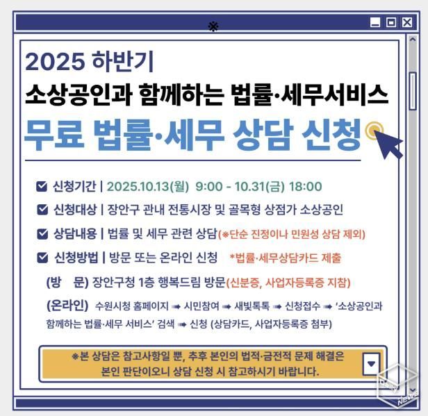 e데일리뉴스 | 수원시 장안구는 오는 10월 13일부터 법률·세무 상담을 받기 어려운 관내 전통시장 및 골목형 상점가 소상공인을 대상으로 쉽고 편리하게 상의할 수 있는 무료 상담인 ‘소상공인과 함께하는 법률·세무 서비스’ 사업을 운영한다.