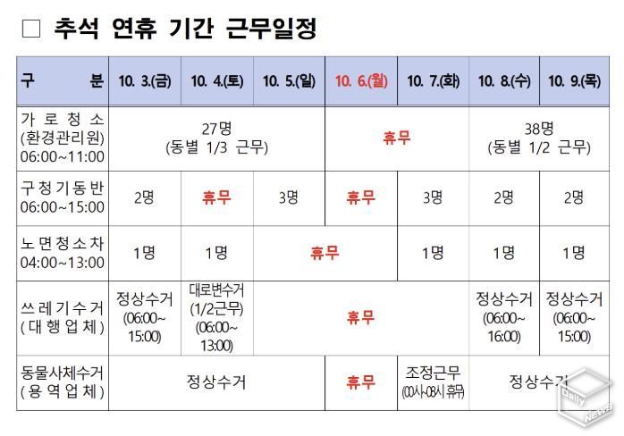 10월 3일부터 9일까지 이어지는 이번 추석 연휴 기간 중 발생되는 적치 쓰레기를 해소하고 청소 관련 민원을 신속하게 처리하기 위하여 동별 청소 인력 배치 및 청소 기동반 운영 등 주민 불편 최소화에 초점을 맞춰 추진된다.