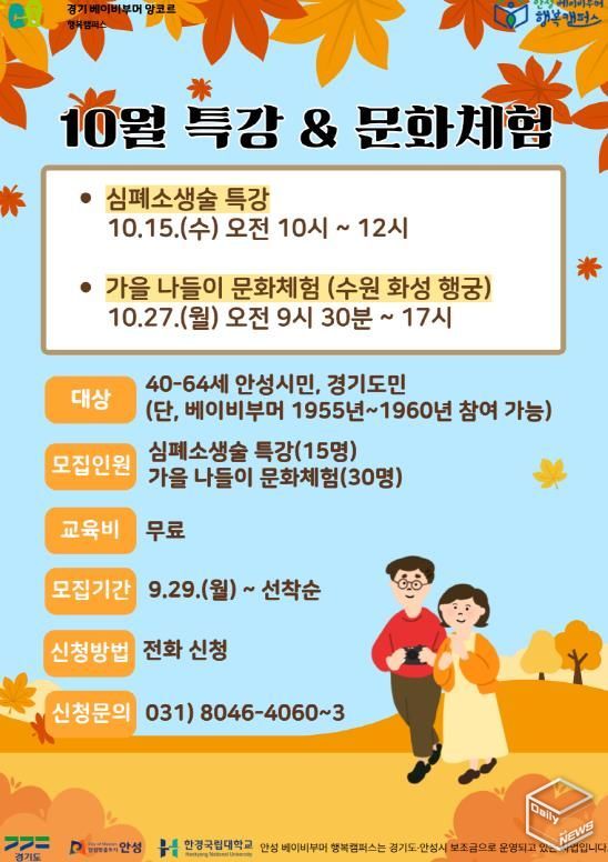 e데일리뉴스 | 안성 베이비부머 행복캠퍼스(한경국립대학교 평생교육원)는 오는 10월 15일부터 27일까지 중장년 안성시민(경기도민)을 대상으로 ‘10월 특강(심폐소생술) 및 문화체험(수원화성행궁)’ 프로그램을 운영한다고 밝혔다.