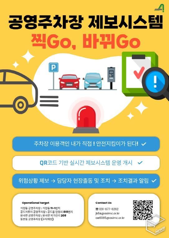 e데일리뉴스 | 안성시시설관리공단은 10월 10일부터 원곡면, 석정동, 공도 저류지, 동본동(수탁예정)공영주차장 4개소 대상으로, 이용객이 직접 주차장의 위험요소나 이용 불편사항을 손쉽게 제보하고 개선에 참여할 수 있는 QR 코드 기반의 실시간 위험상황 제보시스템 “찍Go, 바뀌Go”를 운영한다고 밝혔다.