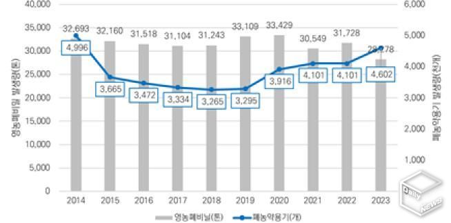 2023년 기준 경기도 영농폐기물 발생량은 영농 폐비닐이 약 3만 톤(93%), 폐농약 용기가 약 460만 개(94%)로 나타났다.