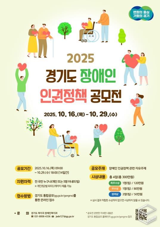 e데일리뉴스 | 경기도가 장애인의 정책 참여 확대, 실효성 있는 제도 개선, 생활 속 인권 향상과 인식 개선을 위한 정책 아이디어 발굴을 위해 10월 16일부터 29일까지 ‘2025년 경기도 장애인 인권정책 공모전’을 개최한다.