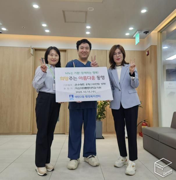 e데일리뉴스 | 지난 15일, 수원시 영통구 소재 미소마취통증의학과의원은 관내 저소득 어르신들이 따뜻한 겨울을 보낼 수 있도록 매탄2동 행정복지센터에 100만원 상당의 온수매트 8세트를 기부했다.