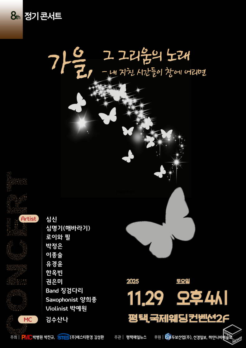 올해 8회째 열리는 공연은 PMC박병원 박진규 이사장과 STES 에스티 환경 김성환 대표가 주최하고 평택매일뉴스가 주관하며 두보산업 정경래 대표, 선경일보, 하얀나비예술회가 후원해 막을 올린다.