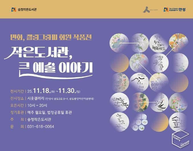 e데일리뉴스 | 안성천 공도 작은미술관 시옷갤러리에서는 오는 11월 18일(화)부터 30일(일)까 지 송정작은도서관의 지역 주민으로 구성된 민화 캘리그라피 회원들의 작품을 모은 전시회 ‘작은도서관, 큰 예술 이야기’가 열린다.
