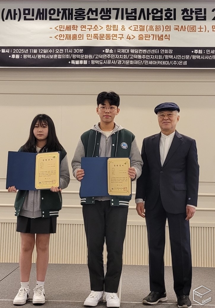 기념사업회는 민세 중학교 박예인·이지환 학생에게 장학금을 수여하며 지역 청소년 교육 지원 의지를 다시 확인했다.