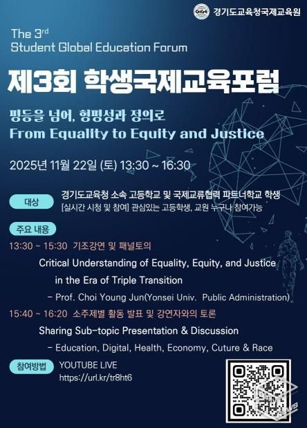 올해 ‘학생국제교육포럼’의 주제는 ‘평등을 넘어, 형평성과 정의로(From Equality to Equity and Justice)’로 참가자들은 교육․디지털․건강․경제․문화와 인종 형평성 등에 대한 문제해결 가능성을 탐색한다.