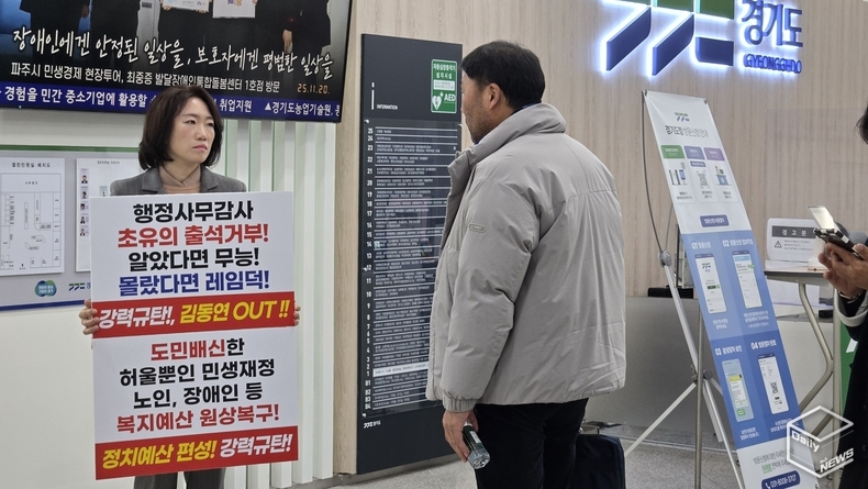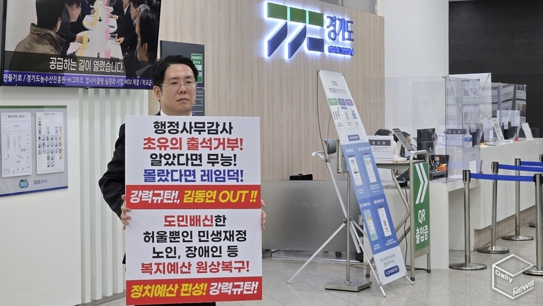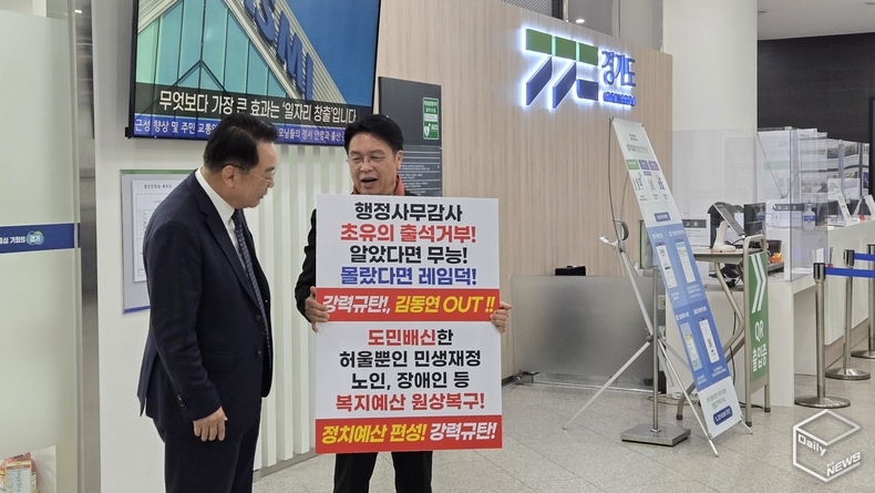 e데일리뉴스 | [경기도=강경숙 기자] 김동연 경기도지사 비서실장과 정무라인이 경기도의회 의회운영위원회 행정사무감사(행감)에 단체로 불출석하며 사실상 감사 거부에 나서자, 의회운영위원회 소속 의원들이 결국 도청 1층 출입문 앞에서 릴레이 시위에 돌입했다.
