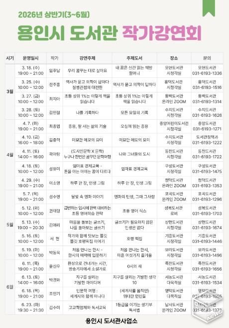 5월에는 7일 '명화의 탄생 그때 그 사람’의 저자 성수영 한국경제 기자(포곡도서관), 12일 '초등 영어 식스'의 저자 권태형 작가(성복도서관), 13일 '글쓰기가 필요하지 않은 인생은 없다'의 저자 김애리 작가(상현도서관), 16일 ‘호랭 떡집’의 저자 서현 작가(기흥도서관), 19일 ‘처음 만나는 한시 마흔 여섯가지 즐거움‘의 저자 박동욱 한양대 교수(보라도서관)가 강연할 예정이다.