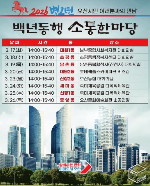 e데일리뉴스 | 오산시가 시민과 직접 만나 시정 운영 방향을 공유하고 지역 현안을 듣는 ‘2026 백년동행 소통한마당’을 개최한다.