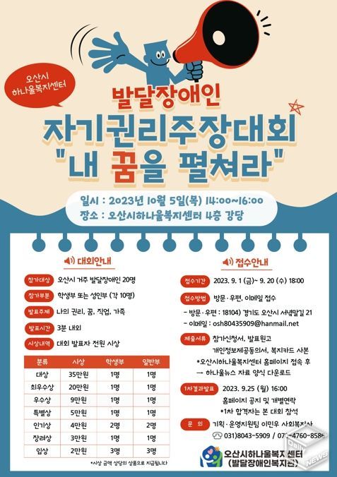 e데일리뉴스 | 오산시하나울복지센터(발달장애인복지관)는 9월 20일까지 3주간 발달장애인을 대상으로 ‘자기 권리 주장대회’ 참가자를 모집한다.